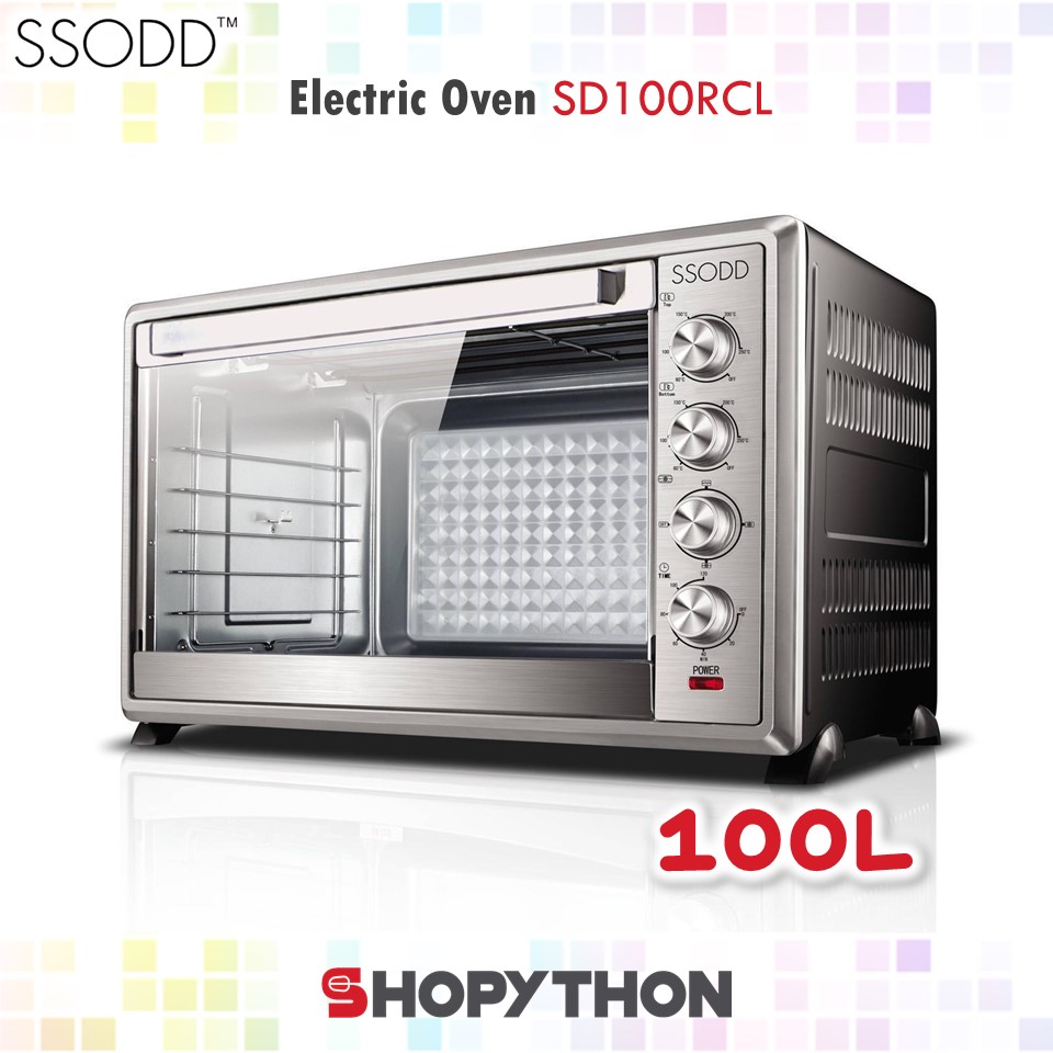 Black glass and black enamel design electric multifunction 5 functions static and grill cooking options rotisserie easy to clean enamel coating minute minder.